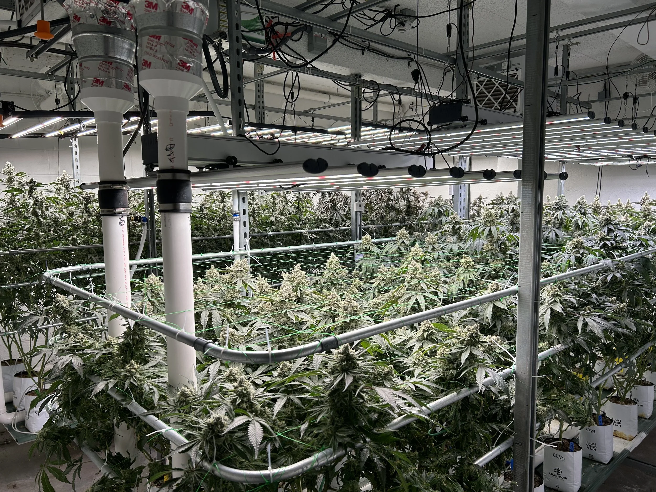 Our grow team was forced to push back our in-store Showcase Flower Room re-load a couple of weeks longer than we’d typically like. We’ve had a few Air Conditioning units that have been malfunctioning over the past few months that needed some maintenance work. When that was complete we worked a long 4 days cleaning and sanitizing. As soon as we could eat off the floor, we felt comfortable enough to move the already overgrown plants out of our veg space and into the Showcase Flower Room. (See the above pic)