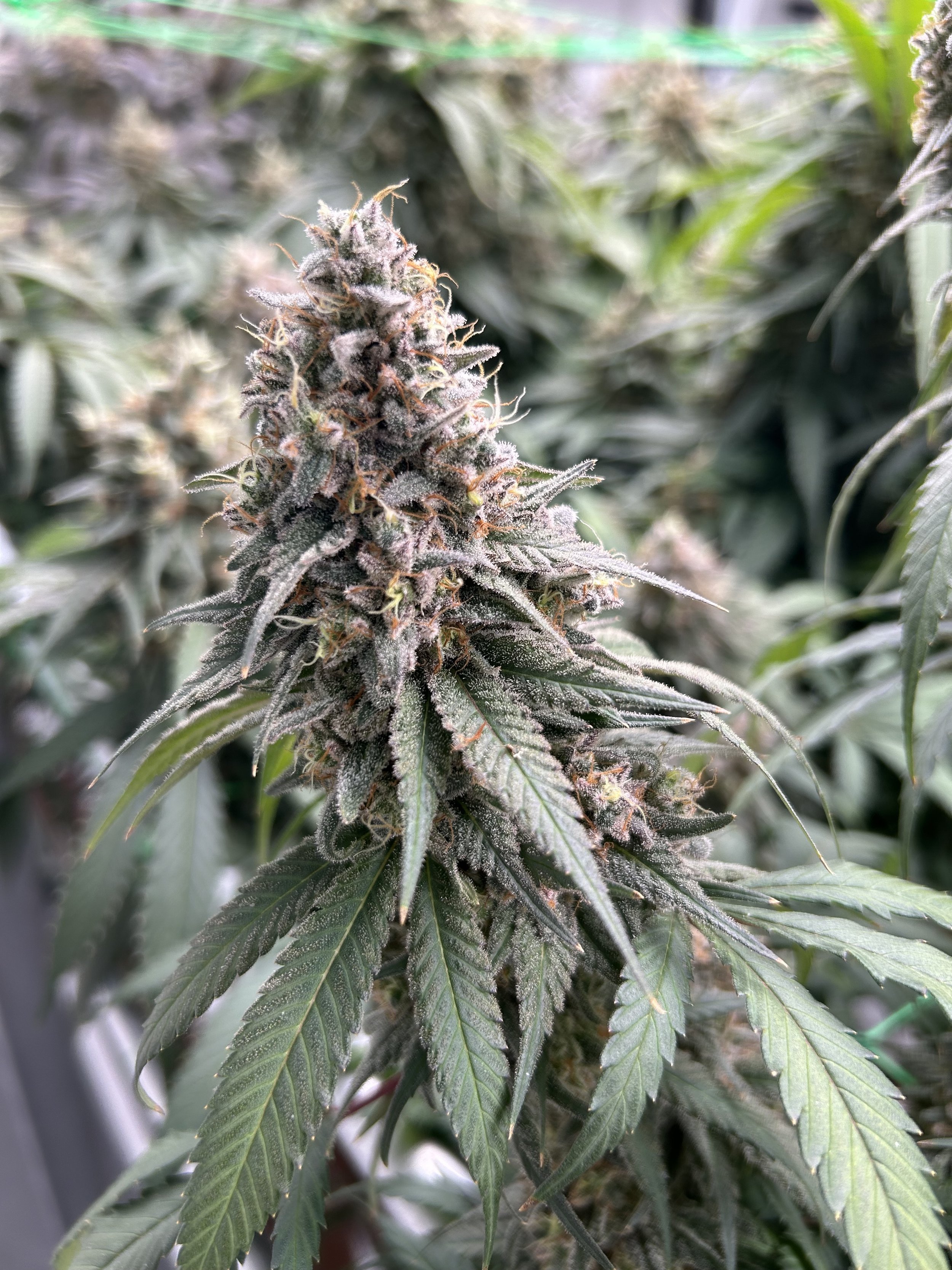 Maintenance in the room is under canopy pruning and leaf removal. This will be the last week of pruning fairly aggressive and using scissors. The material left on the plant now is what will make it through to harvest. The tops of the plants will be gently arraigned in the top layer of the trellis netting. This helps maximize light penetration and can improve air circulation.